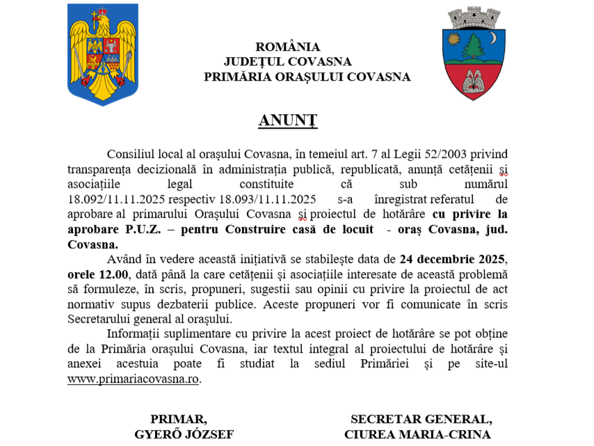 Consiliul local al oraşului Covasna, în temeiul art. 7 al Legii 52/2003 privind transparenţa decizională în administraţia publică, republicată, anunţă cetăţenii şi asociaţiile legal constituite că sub numărul 18.092/11.11.2025 respectiv 18.093/11.11.2025 s-a întregistrat referatul de aprobare al primarului Orașului Covasna şi proiectul de hotărâre cu privire la aprobare P.U.Z. – pentru Construire casă de locuit  – oraș Covasna, jud. Covasna.