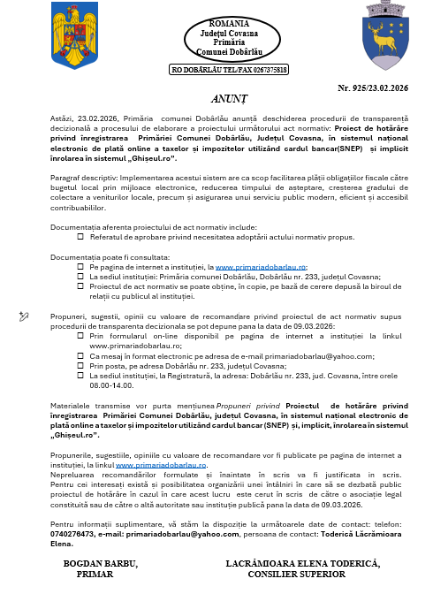 Astăzi, 23.02.2026, Primăria comunei Dobârlău anunță deschiderea procedurii de transparență decizională a procesului de elaborare a proiectului următorului act normativ: Proiect de hotărâre privind înregistrarea Primăriei Comunei Dobârlău, județul Covasna, în sistemul național electronic de plată online a taxelor și impozitelor utilizând cardul bancar (SNEP) și, implicit, înrolarea în sistemul „Ghișeul.ro”.