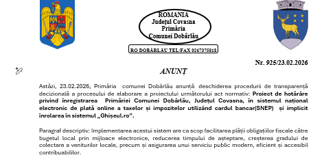 Astăzi, 23.02.2026, Primăria comunei Dobârlău anunță deschiderea procedurii de transparență decizională a procesului de elaborare a proiectului următorului act normativ: Proiect de hotărâre privind înregistrarea Primăriei Comunei Dobârlău, județul Covasna, în sistemul național electronic de plată online a taxelor și impozitelor utilizând cardul bancar (SNEP) și, implicit, înrolarea în sistemul „Ghișeul.ro”.