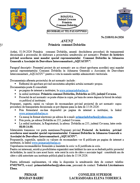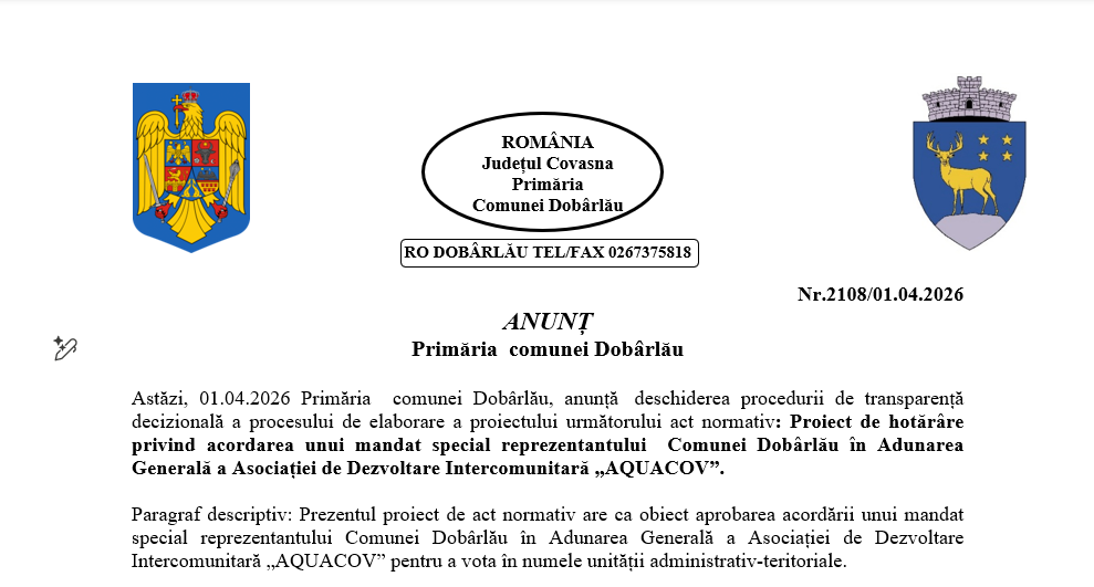 Astăzi, 01.04.2026 Primăria comunei Dobârlău, anunță deschiderea procedurii de transparență decizională a procesului de elaborare a proiectului următorului act normativ: Proiect de hotărâre privind acordarea unui mandat special reprezentantului Comunei Dobârlău în Adunarea Generală a Asociației de Dezvoltare Intercomunitară „AQUACOV”.