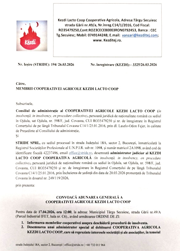 Consiliul de administrație al COOPERATIVEI AGRICOLE KEZDI LACTO COOP (în insolvenţă, in insolvency, en procedure collective), persoană juridică de naționalitate română cu sediul