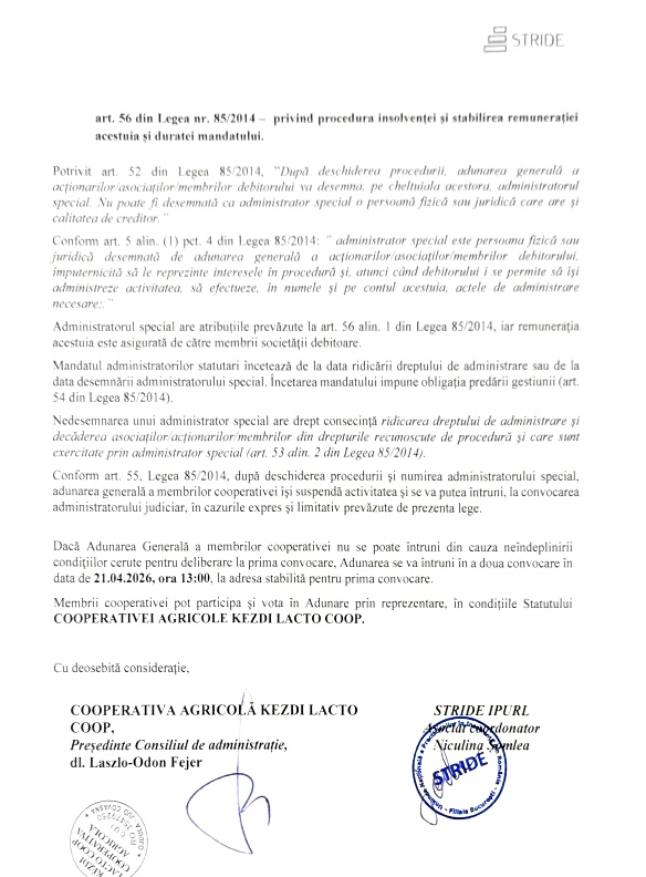 - Desemnarea unui administrator special al debitoarei COOPERATIVA AGRICOLA KEZDI LACTO COOP, care să reprezinte interesele societății şi ale asociaților, în temeiul art. 56 din Legea nr. 85/2014 – privind procedura insolvenței şi stabilirea remunerației acestuia și duratei mandatului.