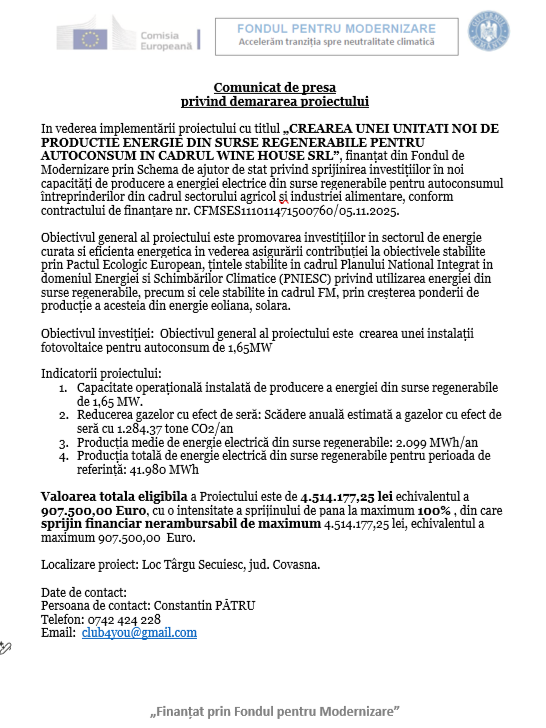 În vederea implementării proiectului cu titlul „CREAREA UNEI UNITATI NOI DE PRODUCTIE ENERGIE DIN SURSE REGENERABILE PENTRU AUTOCONSUM IN CADRUL WINE HOUSE SRL”, finanțat din Fondul de Modernizare prin Schema de ajutor de stat privind sprijinirea investițiilor în noi capacități de producere a energiei electrice din surse regenerabile pentru autoconsumul întreprinderilor din cadrul sectorului agricol şi industriei alimentare, conform contractului de finanțare nr. CFMSES111011471500760/05.11.2025.