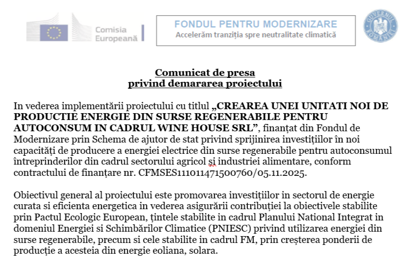 În vederea implementării proiectului cu titlul „CREAREA UNEI UNITATI NOI DE PRODUCTIE ENERGIE DIN SURSE REGENERABILE PENTRU AUTOCONSUM IN CADRUL WINE HOUSE SRL”, finanțat din Fondul de Modernizare prin Schema de ajutor de stat privind sprijinirea investițiilor în noi capacități de producere a energiei electrice din surse regenerabile pentru autoconsumul întreprinderilor din cadrul sectorului agricol şi industriei alimentare, conform contractului de finanțare nr. CFMSES111011471500760/05.11.2025.