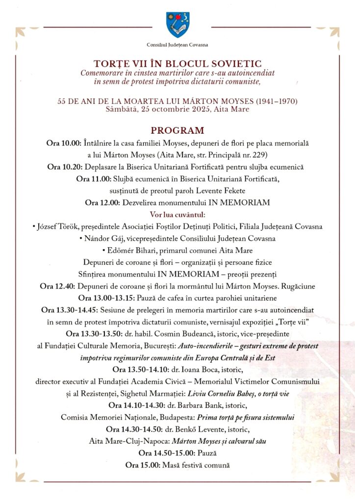 Astfel, pe 25 octombrie se va ține o comemorare în comuna Aita Mare, cu ocazia împlinirii a 55 de ani de la protestul prin autoincendiere al lui Márton Moyses, fost condamnat politic, originar din localitatea covăsneană.