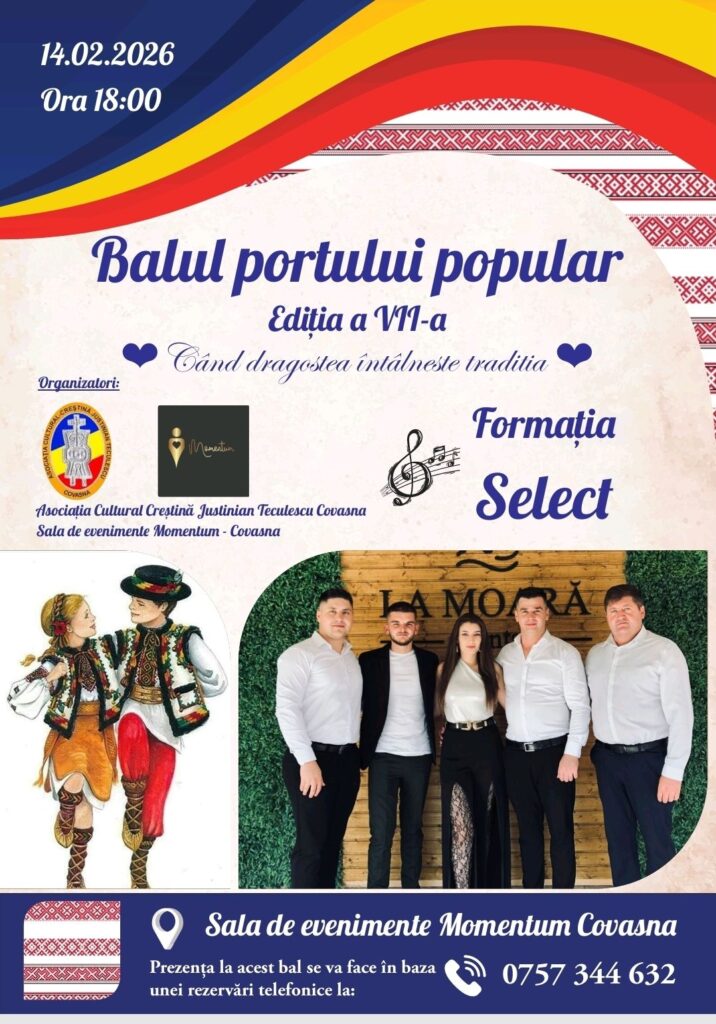 Asociația Cultural-Creștină „Justinian Teculescu” din Covasna organizează pe 14 februarie 2026 o nouă ediție, a șaptea, a Balului Portului Popular. Ziua nu e aleasă întâmplător, fiind asociată cu Lăsatul secului la carne pentru Paștele ortodox, ce are loc din 15 februarie.