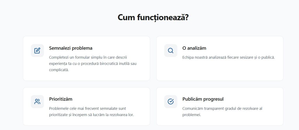 „Prin intermediul platformei lansate astăzi, cetățenii, persoanele juridice și funcționarii publici pot transmite sesizări referitoare la problemele întâmpinate în administrație, precum birocrație excesivă, proceduri greoaie, solicitări redundante de documente sau lipsa digitalizării serviciilor publice. Informațiile primite de la cetățeni sunt colectate standardizat, astfel încât impactul lor să fie evaluat obiectiv, ca timp, costuri și număr de persoane afectate”, se arată într-un comunicat al Executivului citat de Agerpres.