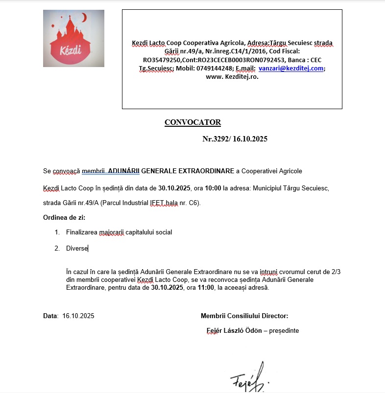 Se convoacă membrii ADUNĂRII GENERALE EXTRAORDINARE a Cooperativei Agricole Kezdi Lacto Coop în ședință din data de 30.10.2025, ora 10:00 la adresa: Municipiul Târgu Secuiesc, strada Gării nr.49/A (Parcul Industrial IFET, hala nr. C6).