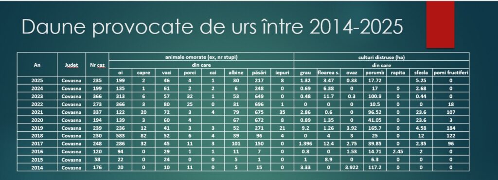 Până azi, statisticile pe 2025 nu arată bine în județul Covasna. Urșii au ucis 199 de oi, 46 de vaci, un cal, peste 200 de păsări și 8 iepuri. Au distrus 17 hectare de porumb, 5 de sfeclă, 3 de floarea soarelui. Lista e lungă și se traduce în daune plătite de la bugetul statului pentru proprietari. Milioane de lei pe an. Datele au fost prezentate recent de șeful Agenției pentru Protecția Mediului Covasna, Gheorghe Neagu.