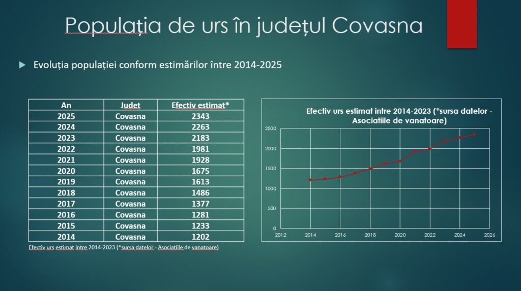 Cu o populație de aproape 200.000 de locuitori, județul Covasna se poate „lăuda” că are un urs la fiecare 86 de locuitori. În 2025, numărul exemplarelor de urs brun este de aproape 2.300, cu o mie de exemplare în plus față de acum 10 ani. Specialiștii fac însă un alt calcul, cel referitor la suprafața fondului forestier. Care a crescut în Covasna, în ultimii ani. Concret, avem în jur de 175.000 de hectare de fond forestier în care se pot plimba și trăi cei 2.300 de urși. Doar că s-au învățat să coboare și prin sate și pe câmpuri…