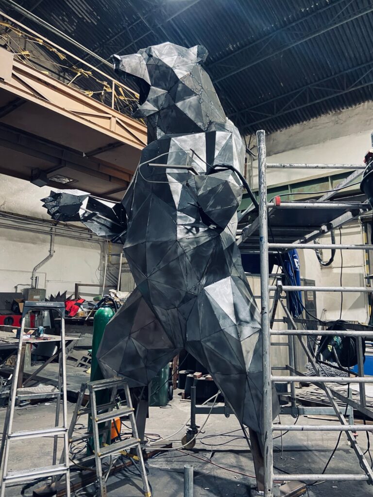 Ursul este fabricat din plăci de oțel corten, iar structura sa internă este din oțel inoxidabil. Oțelul corten este un aliaj metalic special, rezistent la intemperii. Acest material dezvoltă o patină unică, similară ruginii, care acționează ca un strat protector.