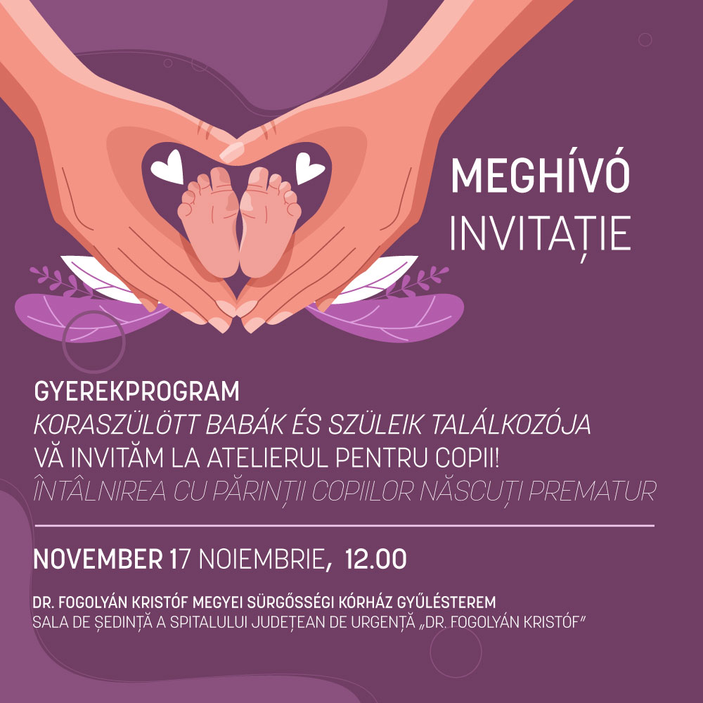 Spitalul Județean de Urgență „Dr. Fogolyán Kristóf” din Sfântu Gheorghe organizează azi, cu ocazia Zilei Naționale a Copiilor Născuți Prematur, o întâlnire specială cu copii născuți prematur și părinții lor.